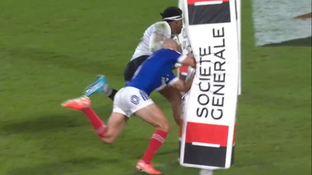 Un retour défensif désespéré qui s’est terminé sur… la protection en mousse des poteaux du Stade Atlantique. Une image insolite et cocasse. Maxime Lucu, sans le vouloir, a bien fait rire tous ceux qui ont suivi le match de samedi soir entre le XV de France et les Fidji. À la 28e minute du match, l’ailier fidjien Kalaveti Ravouvou échappe aux plaquages de Régis Montagne puis Romain Taofifenua pour filer marquer entre les poteaux. Maxime Lucu tente alors un sauvetage désespéré mais, au dernier moment, il vient s’écraser sur la protection en mousse qui protège les poteaux, qu’il n’avait pas vue.