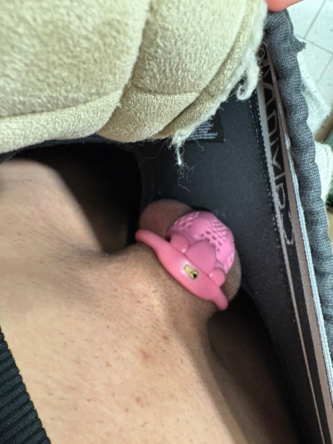 Cette publication est présentée avec cette description: Je porte la cage de chasteté au supermarché.